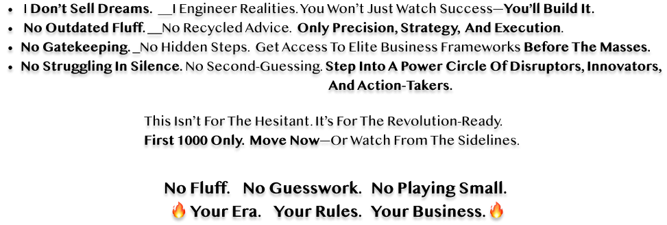 People aren’t “resigning”—they’re revolting. The 9-to-5 model has hit a terminal decline, and millions are building their own seats at the table. But here’s the problem: Most will fail because they don’t have a real system. That’s where I come in. My system isn’t a “business idea”—it’s a fully weaponized blueprint for profit from DAY 1.